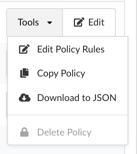 From Actions, either select Edit, or Tools > Edit Policy Rules. You can also copy a policy, download the policy to JSON, or delete the policy.